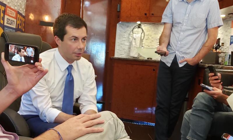 “Look, it’s important to me that I am the same person on the stump with 600 people as I am here on the bus,” Buttigieg said. “But it’s also the case that you get to have a different kind of conversation.”