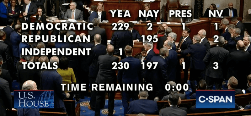 Article 2 – Obstruction of Congress, was supported 229-198. Three Democrats voted against the second article and no Republicans voted in favor. Gabbard again voted present.