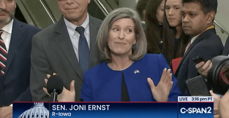 Politico reported in November that Ernst “literally danced a jig while singing: ‘Pete Buttigieg, is moving ahead!’” in reference to the impeachment holding down senators running for president.