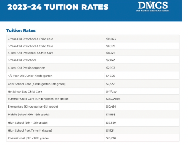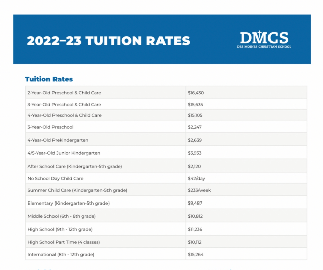 - Des Moines Christian School: 2022-23 tuition rate: $11,236. 2023-24 tuition rate: $12,360. A 10% increase. These rates are only for full-time, domestic students and do not include additional fees.
