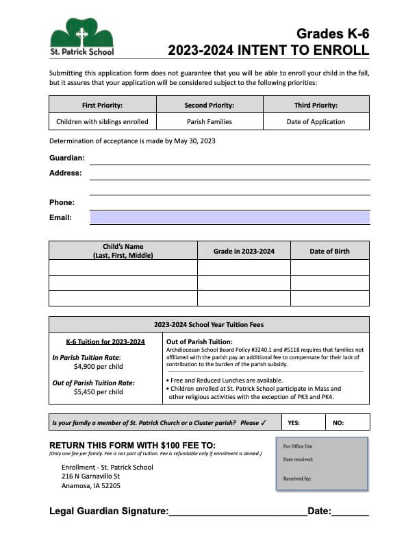 - St. Patrick School in Anamosa (K-6): 2022-2023 tuition rates: $2,450 for parish members and $2,725 for non-parish members. 2023-2024 tuition rates: $4,900 for parish members and $5,450 for out-of-parish members. The price of tuition was doubled for all students.