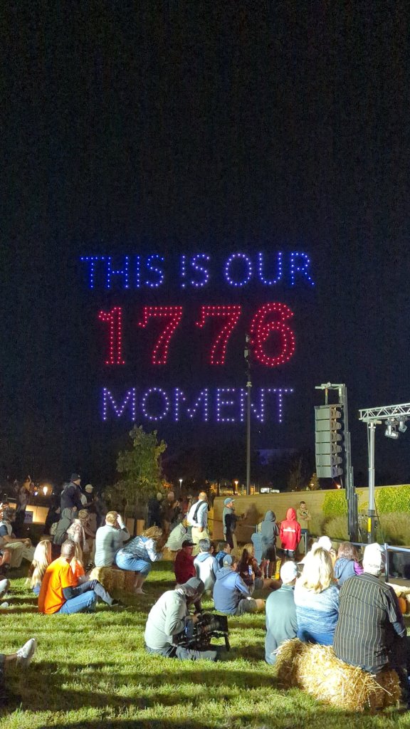 “We fight for the truth. We fight for the truth and we stand up for the truth. This is our 1776 moment,” Vivek yelled into the mic while he pointed to the drones as they spelled out “This Is Our 1776 Moment.”