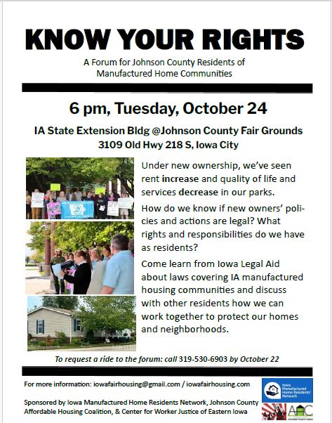 They’re holding a Know Your Rights forum for mobile home residents on Tuesday, Oct. 24 at 6 p.m. at the Johnson County Fairgrounds, where residents along with Iowa Legal Aid will be on hand to discuss problems and potential solutions.