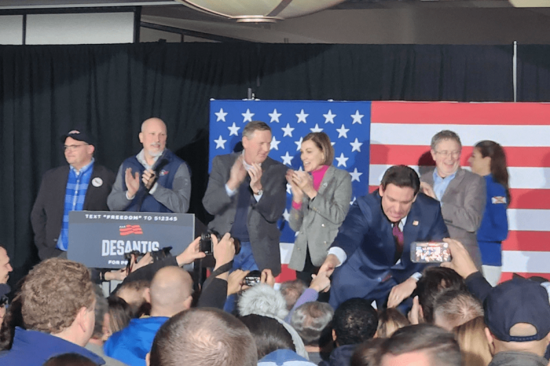 At his caucus event at the Sheraton hotel in West Des Moines, DeSantis’ supporters milled in and around the room with drinks for more than an hour waiting for him to speak. When the music finally died down and speakers took the stage, the crowd began to chant “Ron, Ron, Ron” while waving campaign signs.