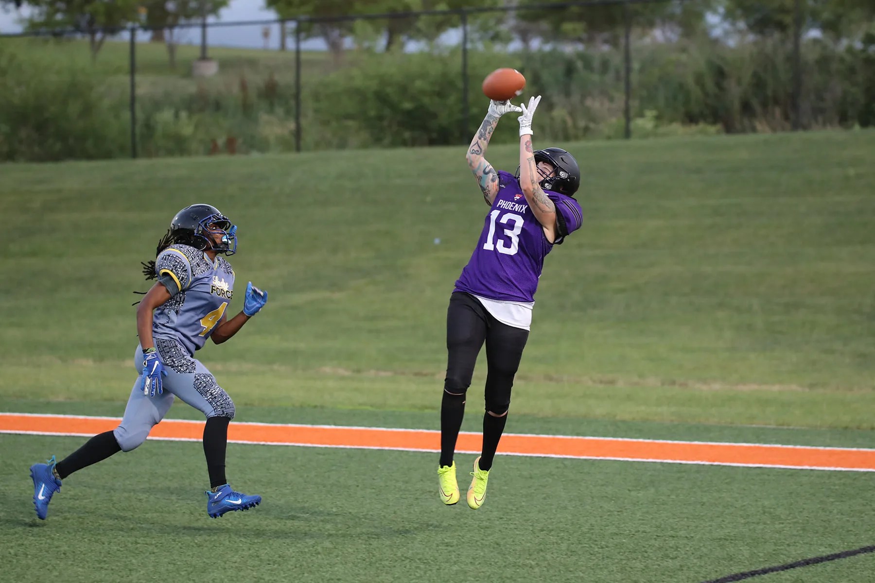 Women’s tackle is similar to the men’s game: It’s played with 11 on 11 on a 100-yard field, wearing full shoulder pads and helmets. So if you like and are already familiar with that game, it’s pretty self-explanatory!