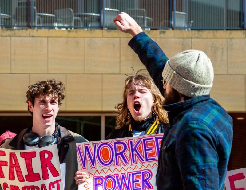 Students attend a “Back to Bargaining Rally” outside of the Joe Rosenfield `25 Center on Feb. 28, 2024. Bargaining between the Union of Grinnell Student Dining Workers and the College resumed in February after nearly a year hiatus, leading to the historic contract that was approved on Thursday, April 4, 2024. (Zach Spindler-Krage, The Scarlet and Black)