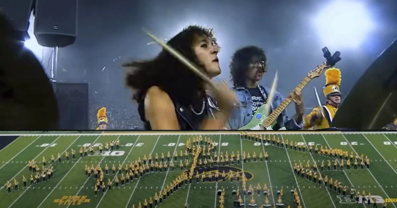 The University of Iowa Hawkeye Marching Band (bottom) performs with the Hawkeye Metal Band (top) in a September 2023 halftime performance of Metallica's music at Kinnick Stadium. (Screenshot of video from University of Iowa.)