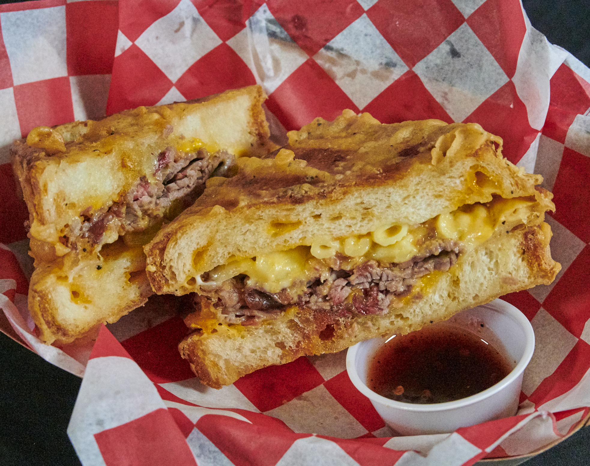 It’s an American cheese grilled cheese sandwich on bacon-cheddar bread, layered with bacon brisket and macaroni and cheese, then deep fried and served with a raspberry chipotle BBQ sauce.