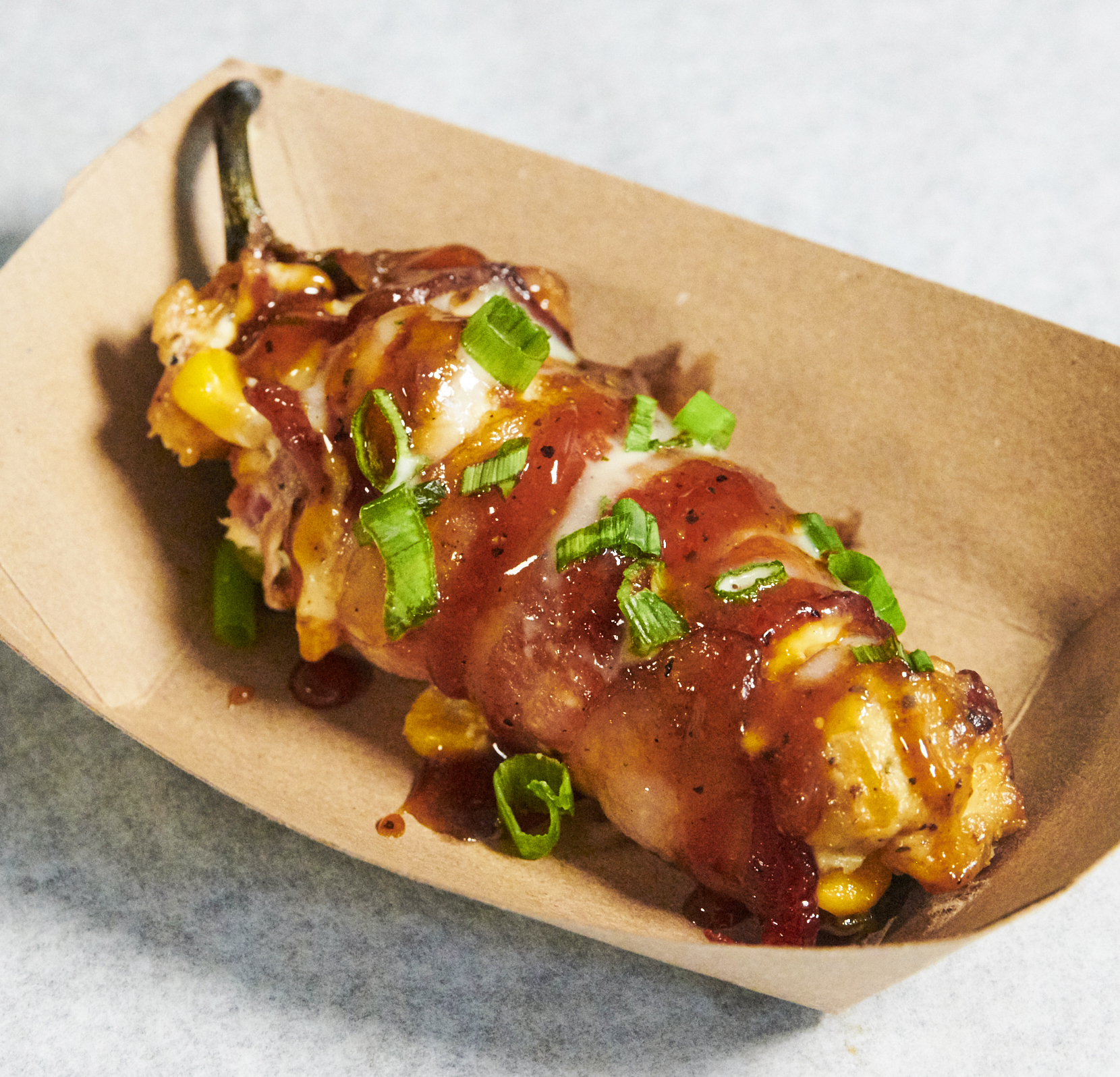 Proving that “gluten-free” doesn’t have to mean “healthy,” the Grinder Ball ($6.50, The Bacon Box) is bacon balls, wrapped in bacon, and rotisserie smoked on a stick instead of batter fried (making it gluten-free).