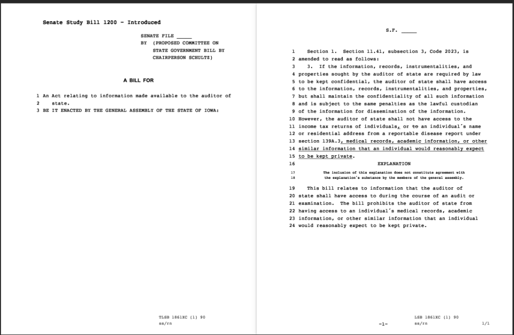Iowa Republicans have framed the bill as a “privacy protection act” and as a way to keep the auditor’s office in line with “generally accepted government auditing standards,” which the office already adheres to.