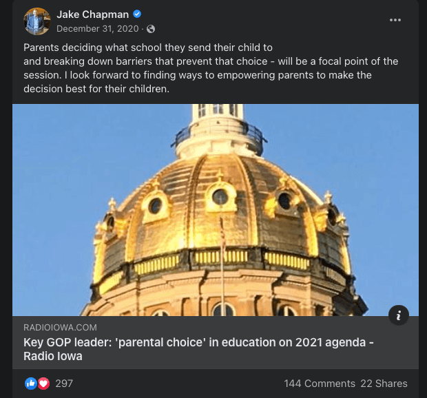 Speaking of vouchers, Chapman has attached his name to several previous attempts at creating private school vouchers in Iowa.