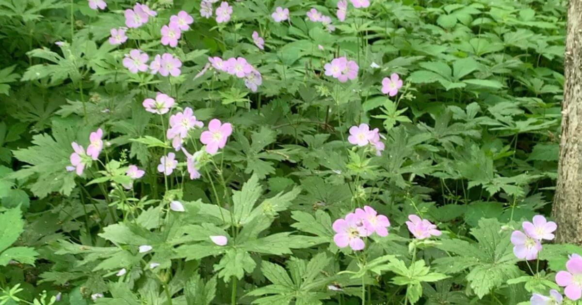 What we saw blooming in late May: Light-purple Virginia waterleaf, deep-pink wild geranium, and red-orange western columbine in deep shade, according to the Seek app.