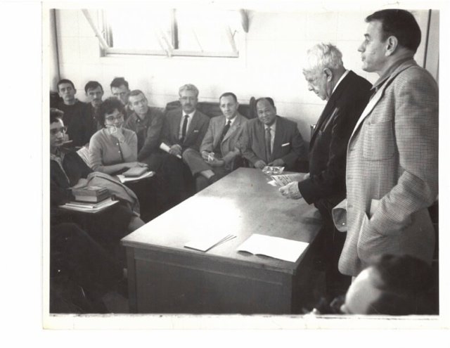Paul Engle and Robert Frost speak to a classroom. Credit: University of Iowa. Iowa Writers’ Workshop