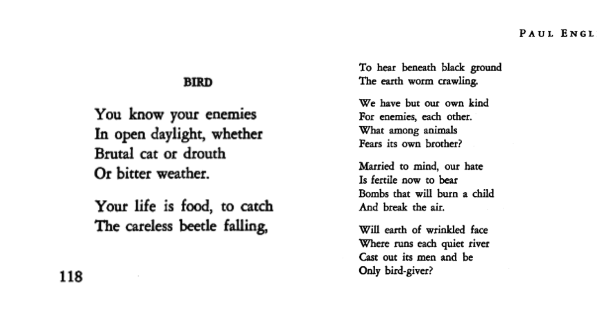 His poem “Bird,” published December 1939 in Poetry Magazine illustrates that. It’s included in a collection of his poems in a section called “Our Human Strength” that ends with his poem by the same name.