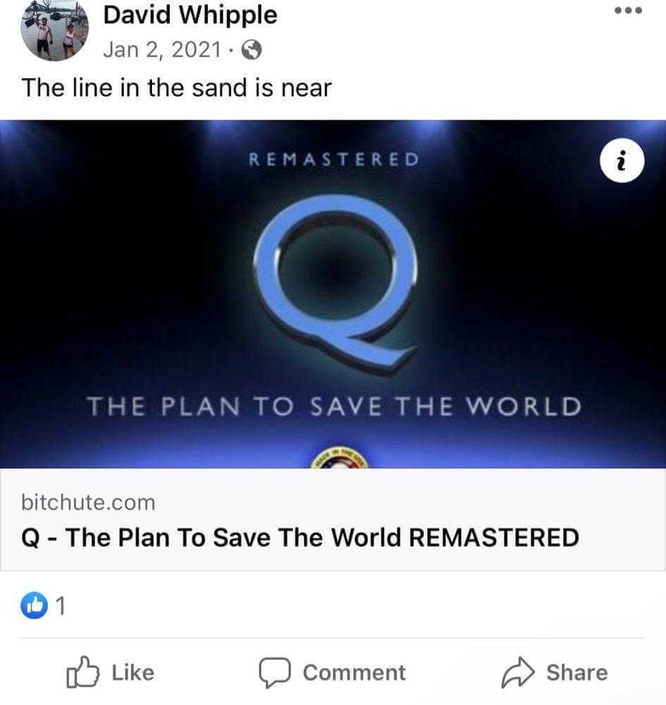 In since-deleted posts, Whipple shared various conspiracy theories about the election, QAnon, and even the 9/11 terrorist attack.
