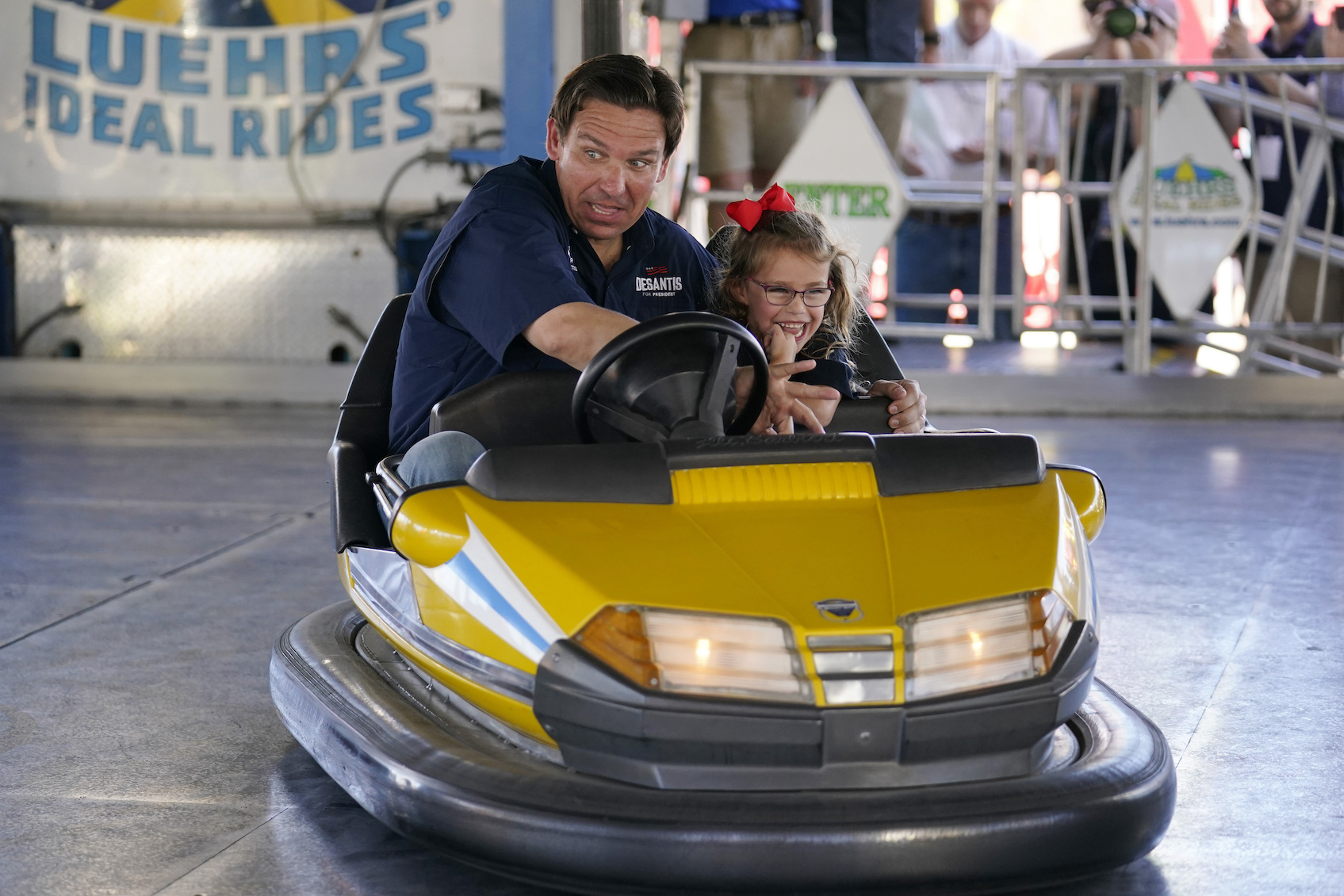 There, the family did bumper cars, the three children played a number of games and rode the Ferris wheel, accompanied by Sen. Joni Ernst. While walking, DeSantis carried one of his daughters on his shoulders, even while going to see the butter cow in the agriculture building. While he walked, DeSantis was followed by a decent-sized crowd, though it was comprised of more reporters than supporters.