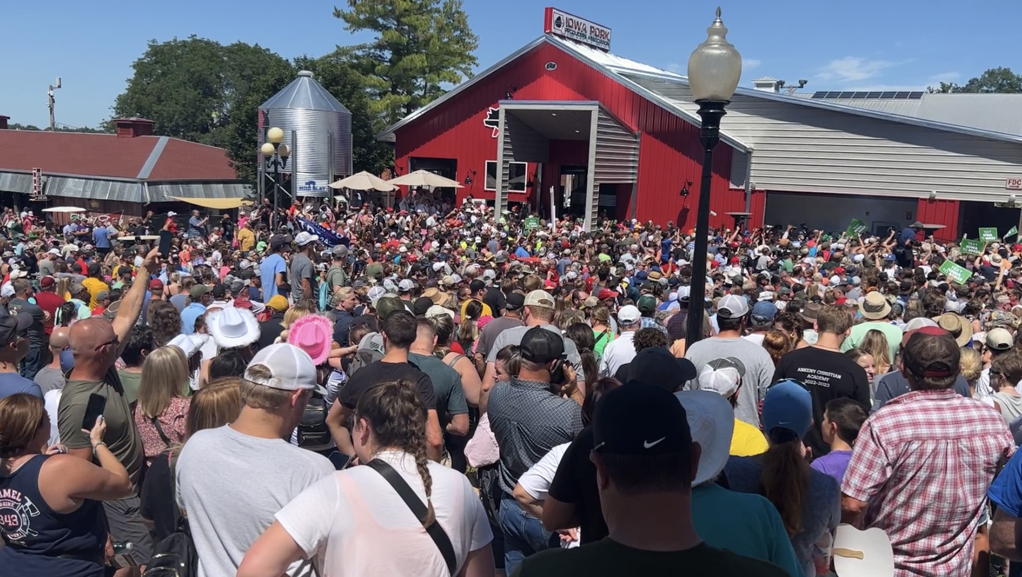 Trump finally arrived after an unscheduled stop at the Iowa Pork Producers that drew more than 1,000 spectators. Some people inside Steer N Stein watched the spectacle on their phones while awaiting his arrival.