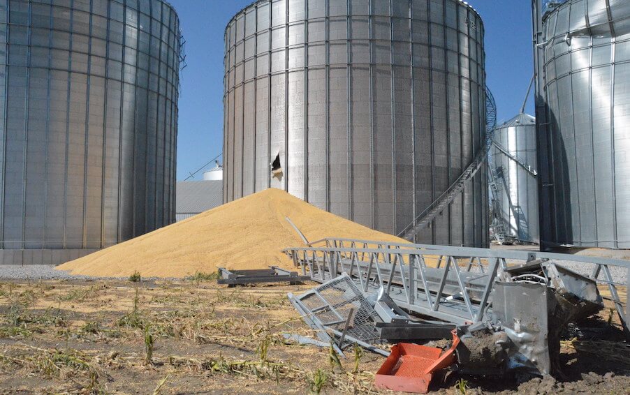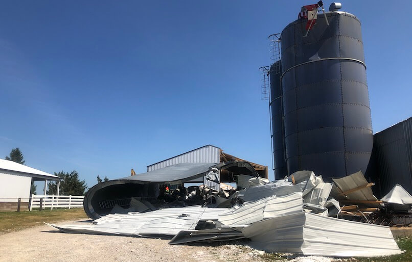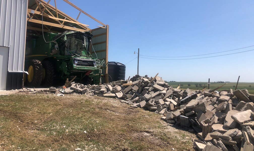 Currently growing corn and soybeans and alfalfa hay with a small cow calf operation and some horses for amusement, only two of 12 bins survived undamaged from the storm, while three are completely totaled along with their combine. Many of their crops are flattened or damaged while other buildings, including a massive workshop, sustained significant damage.