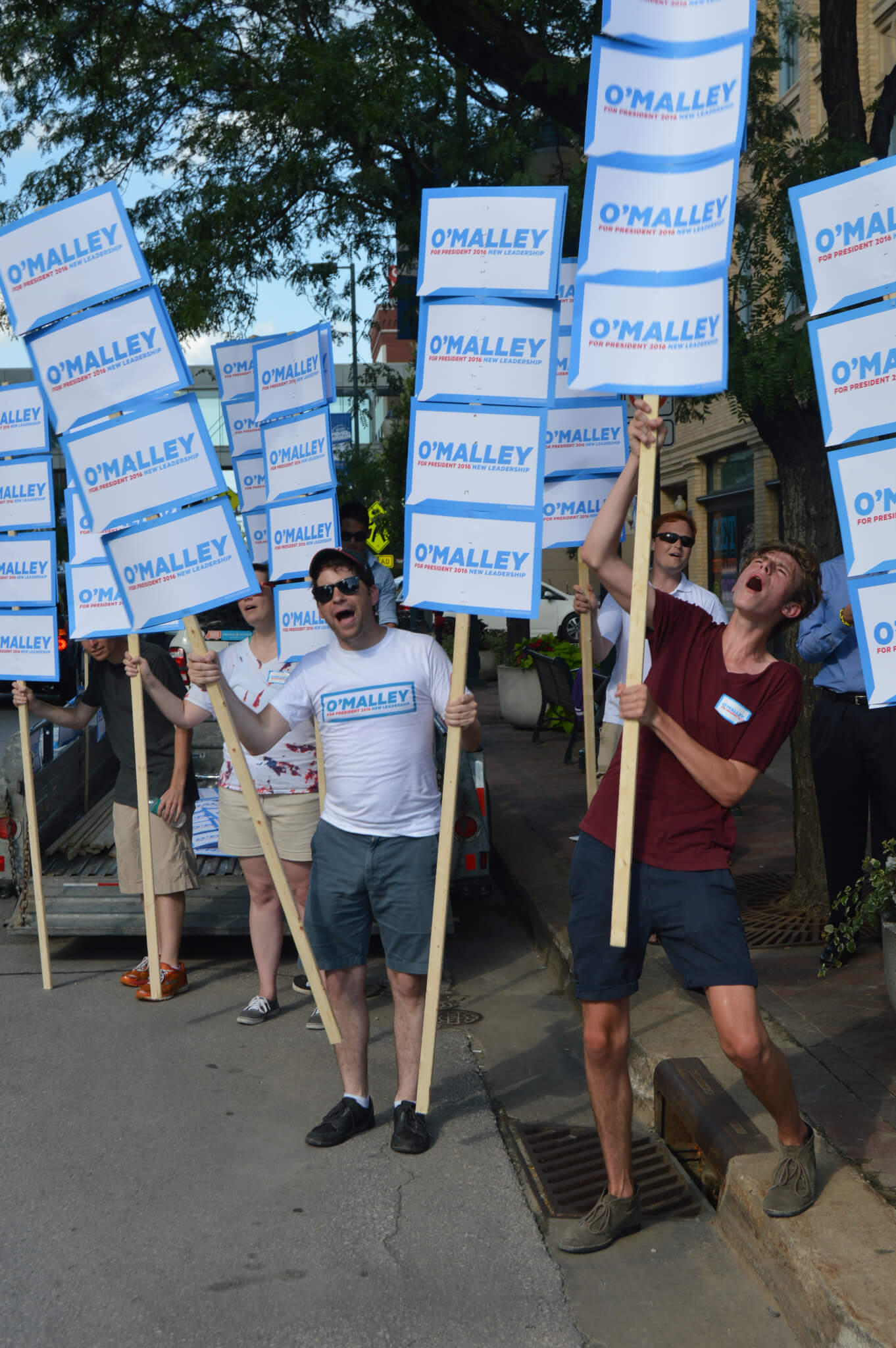 A group of Martin O’Malley supporters got reinforced by members of the O’Malley Super PAC, Generation Forward, which is working to hire its own campaign team in Iowa. The Generation Forward volunteers stood across the street from O’Malley’s volunteers, sometimes joining in the same chants. Which raises the humorous question – does joint chanting constitute coordination?