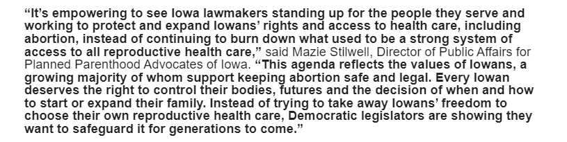 “It’s always the right time to talk about reproductive freedom, and it’s always the right time to tell Iowans that one party stands firmly with them—with the majority of Iowans—in defending their rights to make their own health care decisions,” Konfrst said.