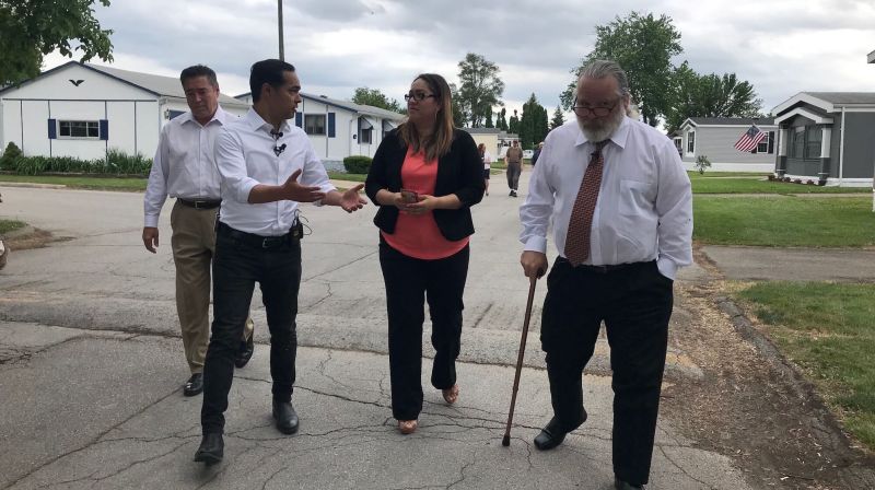 Photo: Julian Castro touring a trailer park in Waukee where rents spiked with local activists in June.