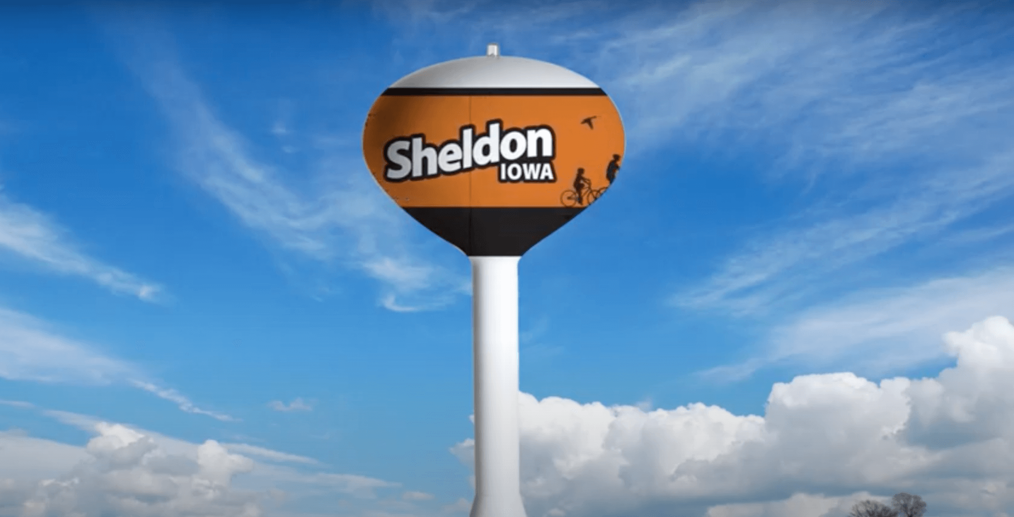 New Sheldon, Iowa, water tower. Screenshot from City of Sheldon
