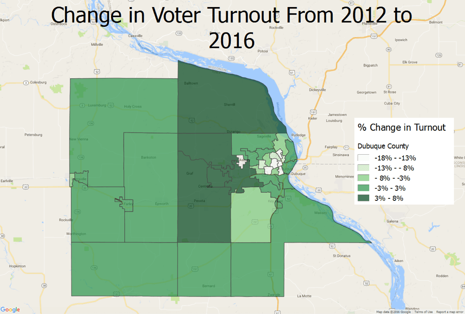 As you can see, the most Democratic area of Dubuque is also where Trump saw some of his best improvements. We’ll take a closer look at that in a moment, but first here’s a map of how turnout changed in 2016: