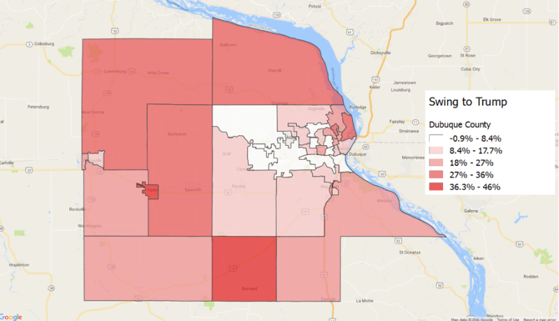 However, the magnitude of the raw vote shifts in Dubuque County is astonishing. Clinton lost more than one out of every four votes that Obama got in Dubuque’s downtown precincts, an area that is historically one of the strongest in the entire state for Democrats. A precipitous drop in turnout in precincts with younger voters cost Clinton hundreds of votes. And one rural precinct saw a 45-point swing toward Trump over Republicans’ 2012 performance.
