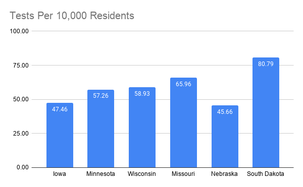 While Iowa seems to be right in the middle of its neighbors, the per capita numbers are dependent on testing right now. There have been large discrepancies in the number of tests between the states, and with more tests, more cases can be properly identified and managed. The graph below shows the differences in testing, and demonstrates how Iowa and Nebraska are falling behind their neighbors in the number of tests done per resident. Without adequately testing the population, there is no way to fully identify the amount of cases, and thus help stop the spread of the virus.