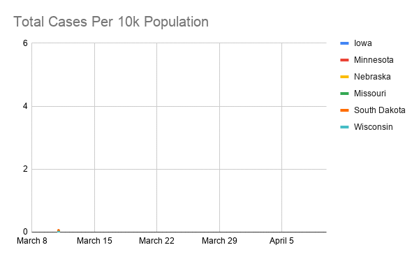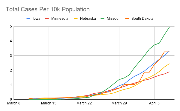As the coronavirus continues to spread across the country, it is interesting to look at some of Iowa’s neighboring states to see how the case numbers and responses compare. Gov. Kim Reynolds reported today that Iowa has a total of 1,388 cases in the state, which comes out to just over 4 cases per 10,000 people.