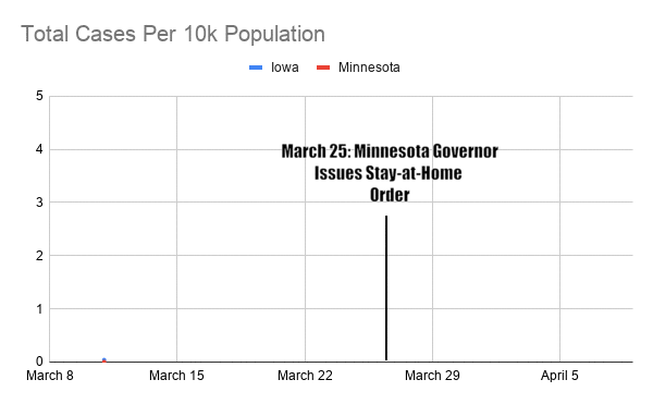 Another interesting comparison between states is to look at the difference between Iowa and its neighbor to the north, Minnesota. Minnesota has taken aggressive mitigation measures and Gov. Tim Walz announced a stay at home order on March 25, which went into effect on March 27. This order not only closed all bars and restaurants, but directed all Minnesotans who were not necessary personnel to stay at home. Some have also argued that simply issuing such an order also has an impact on people’s behavior, driving home the seriousness.