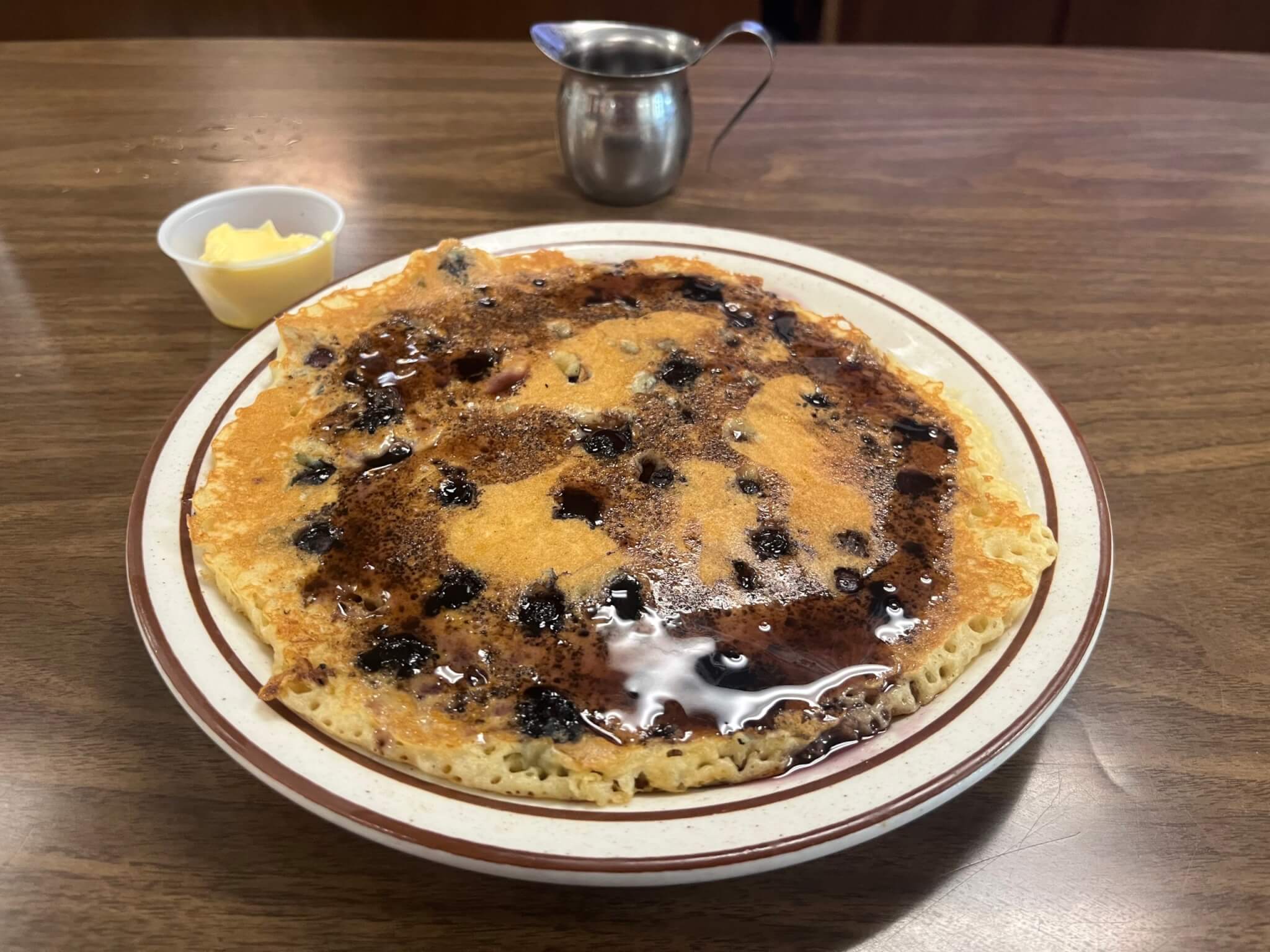 Described as “one fluffy pancake with juicy blueberries, served with blueberry syrup,” the description was not wrong. The pancake was super fluffy. Despite being the size of the vintage cafe plate, the lightness of the pancake never made me feel too full. The pancake also possessed more flavor and taste than other pancakes from my past college nights at Perkins or Village Inn.