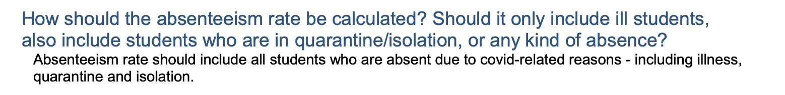 This change also comes after the DOE on Aug. 14 released through Frequently Asked Questions document a statement on how absenteeism rates are calculated. The department said the rates should include all students who are absent due to COVID-related reasons, including illness, quarantine and isolation.