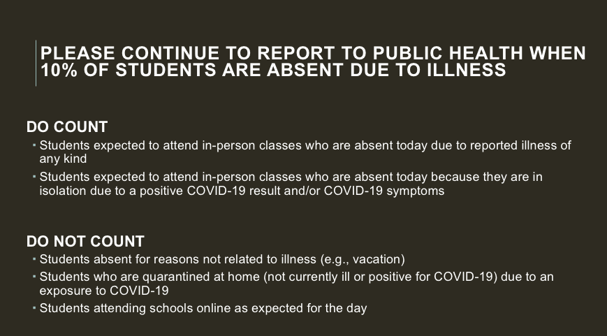 “We’ve had some questions on ‘how do we count students that are being quarantined? And how do we count students that might be doing 100% distance learning? We have some dos and don’ts when it comes to counting that 10%,” she said, pointing to the change—outlined in a PowerPoint presentation originally circulated to school nurses.