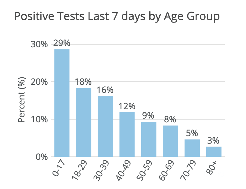 State data, updated this week, show that, statewide, children ages 0-17 make up 29% of the positive tests in the last seven days, the highest of any individual age group.