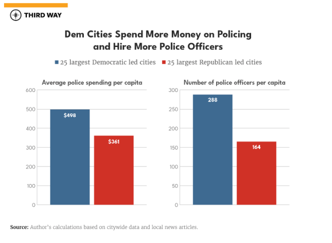 It’s also significant that no Democratic politician is currently running on defunding police. In fact, Democratic-run major cities spend 38% more on policing per capita than Republican-run cities; 80% of the largest cities have increased policing funding since 2022.