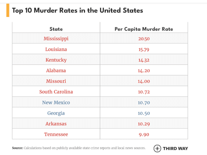 Mississippi had the worst with 20.50 murders per 100,000 residents, followed by Louisiana with 15.79 murders per 100,000 residents.