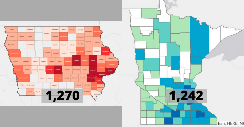 Iowa surpassed its northern neighbor of Minnesota today in the total number of positive coronavirus cases reported. Gov. Kim Reynolds announced at her press conference this morning that there are 125 new cases in Iowa, the state’s single highest one-day jump, bringing the statewide total up to 1,270. After Minnesota’s daily update this morning, their state stood at 1,242. For much of the last week, Iowa’s daily numbers have signficantly outpaced Minnesota’s.