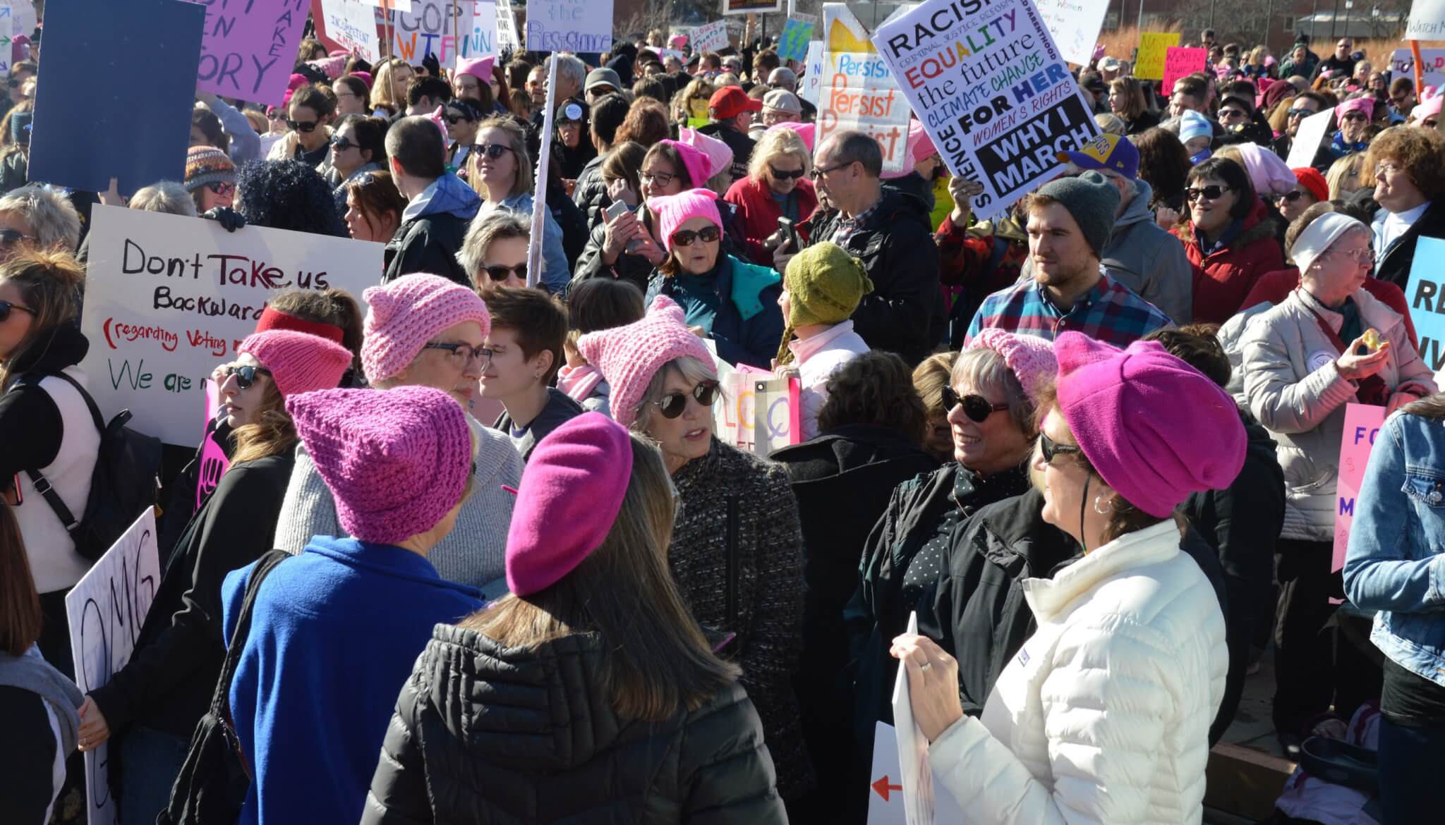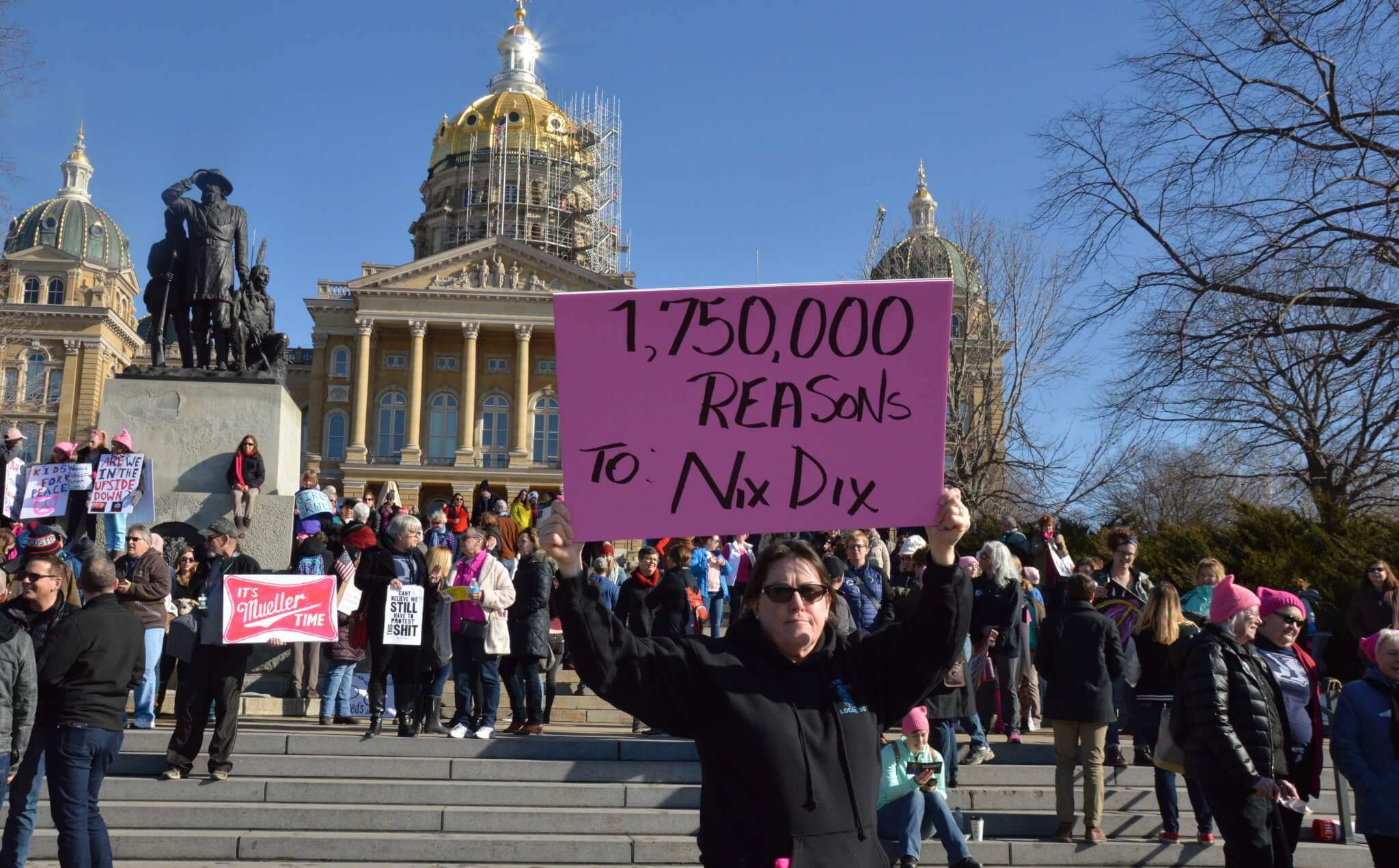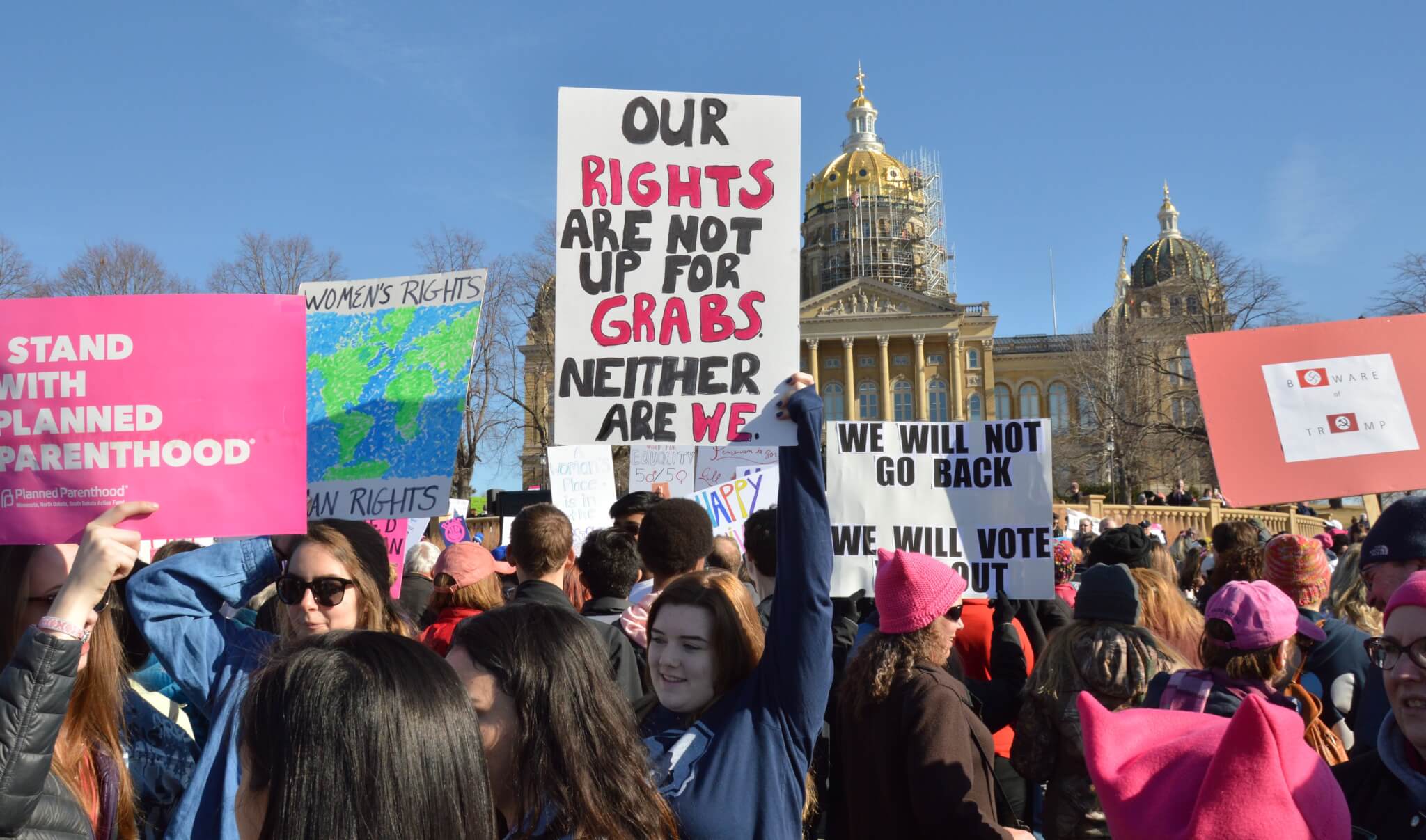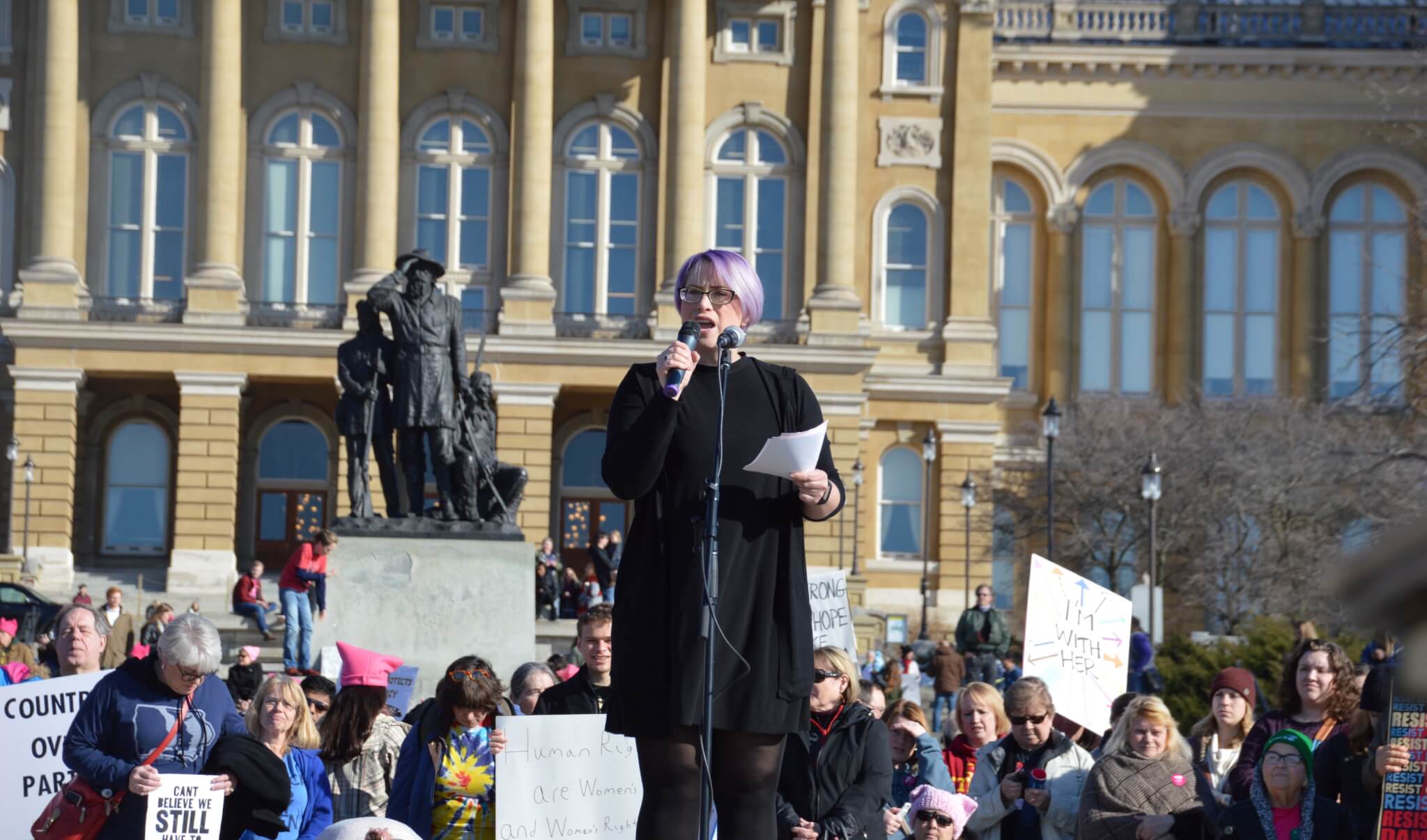 On a bright and sunny Saturday afternoon, one year to the day of Donald Trump’s inauguration, close to 10,000 people gathered outside the Iowa State Capitol building for this year’s Women’s March. Thousands of activists, voters and concerned citizens came out sporting pink clothing and hats, homemade signs and a passion for fighting back in 2018.