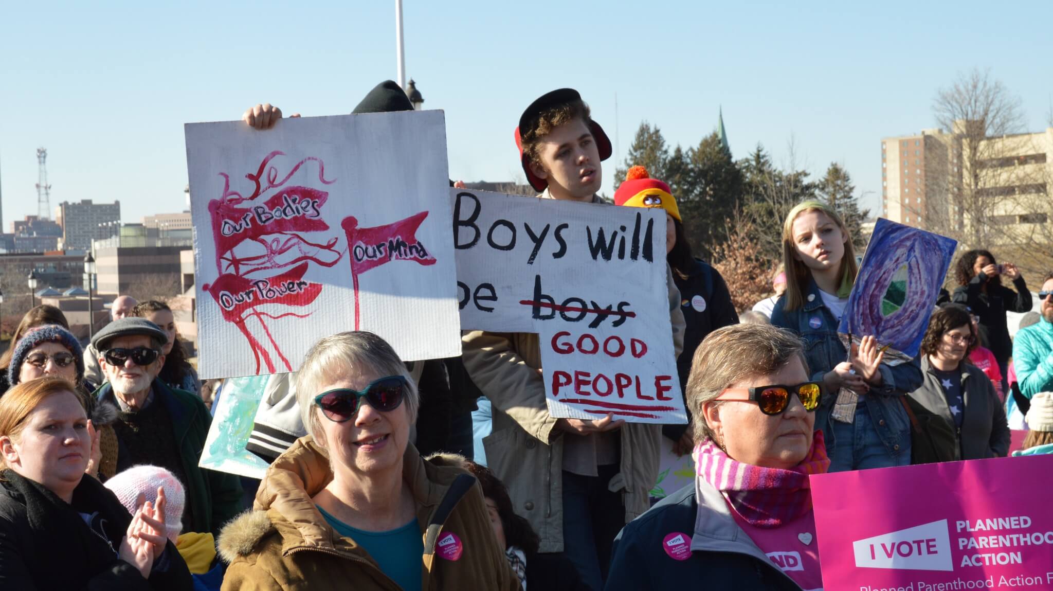 Many people brought their own homemade signs to the event, covering topics both around female rights and just progressive policies in general.