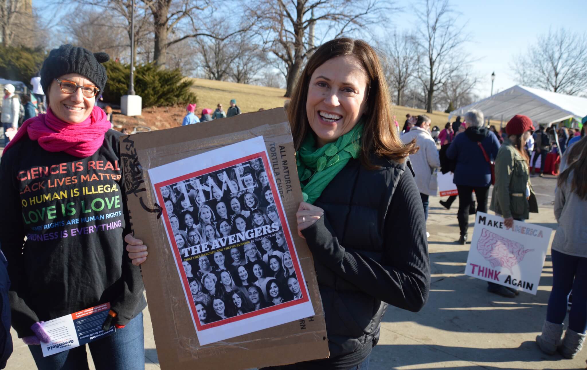Theresa Greenfield had a particularly unique sign for the event. She appeared on the cover of Time Magazine this week with a group of women running for office.