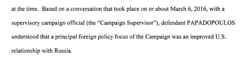 Papadopoulos was brought onto the Trump campaign in March of 2016 to serve as a foreign policy adviser (even though his credentials in that field were somewhat suspect). His early meeting with the Campaign Supervisor on March 6 made clear that improving U.S.-Russia relations was a “principal foreign policy focus of the Campaign.”