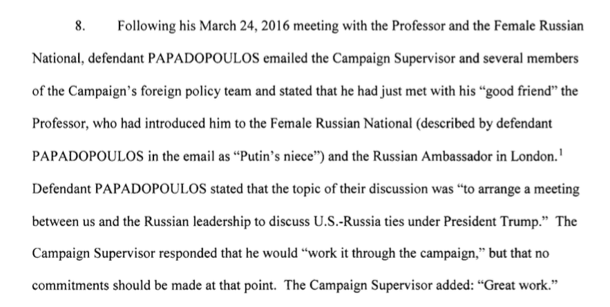 Papadopoulos met with Russian contacts on March 24, during which they urged high-level meetings between the Trump campaign and Russian officials. The Campaign Supervisor praised Papadopoulos’ efforts as “great work” and said he’d run it up the chain of command.