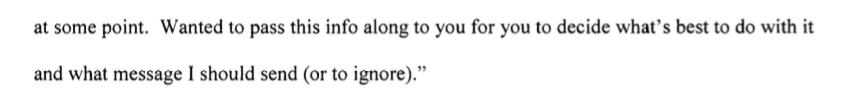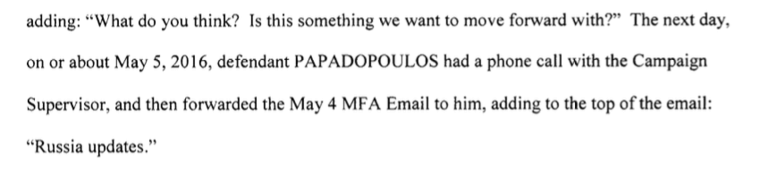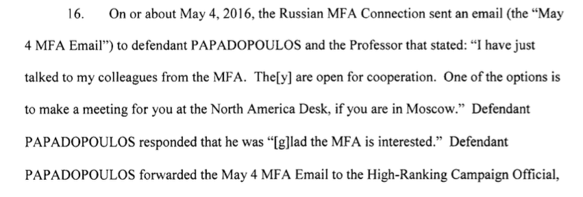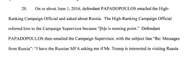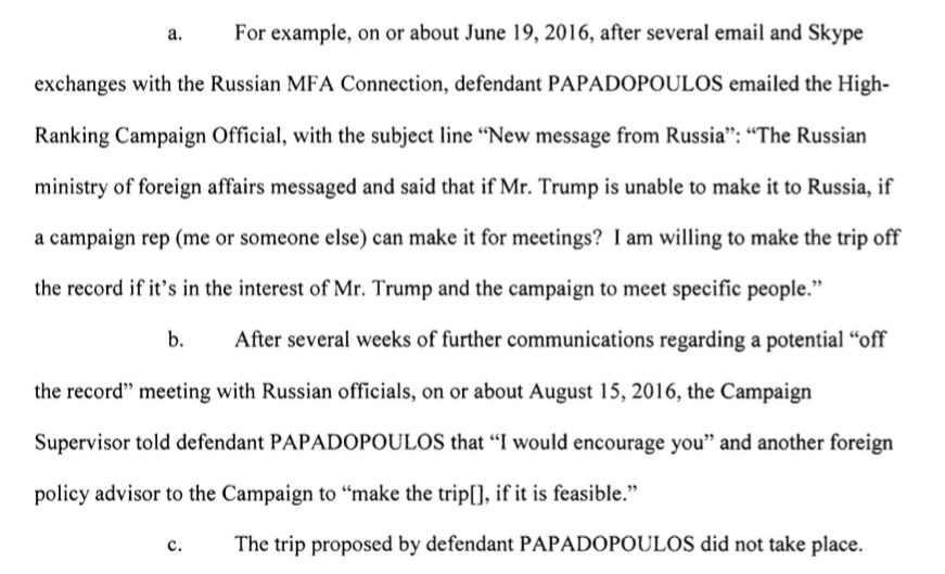 Mueller appears to have plenty of information on those later interactions, but only lists one of them. That one involves Papadopoulos telling the High-Ranking Campaign Official that the Russians want to set up a meeting in Russia, and suggests that he could go if Trump himself cannot. The Campaign Supervisor encourages Papadopouls to make the trip, but it never happens.
