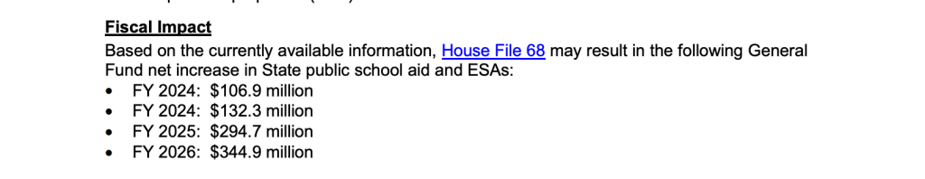 The Iowa Legislative Services Agency (LSA) estimated the program’s first four years will cost about $878 million, including about $107 million for the 2023-24 school year.