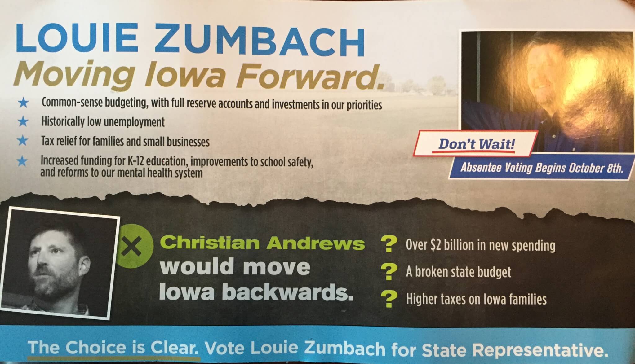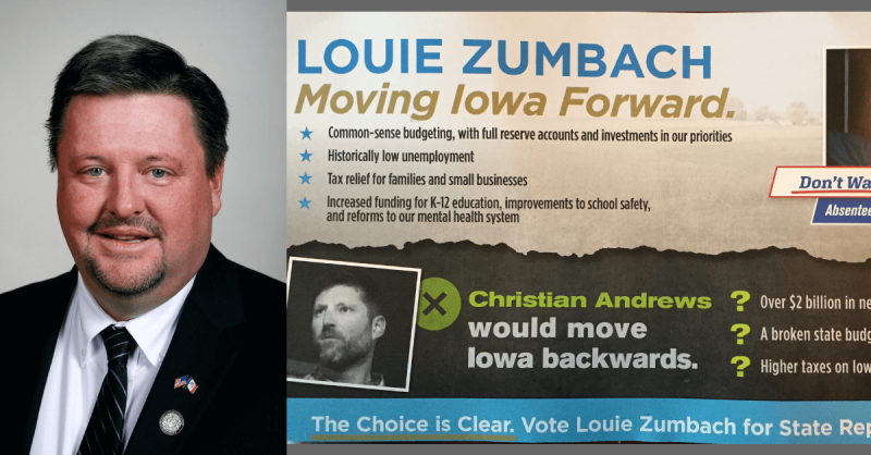 In a direct mail piece that voters in House District 95 (rural Linn County) received recently, the one-term Republican incumbent pitches his policies as “Moving Iowa Forward.” He also warns that his Democratic opponent, Christian Andrews, would do quite the opposite and “would move Iowa backwards.” Zumbach lists three scary-sounding things next to Andrews’ photo: