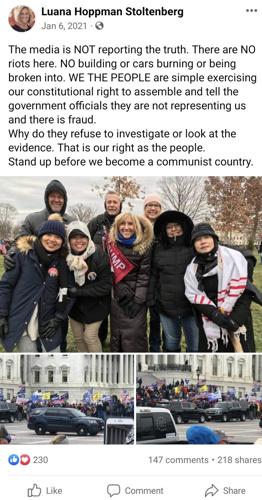 But Stoltenberg, an author and speaker who campaigned on her anti-abortion views and on ending civil rights protections for LGBTQ Iowans, did more than just talk the talk: She traveled to Washington, DC (she says with a “prayer group”) to attend Trump’s “Stop the Steal” rally, posting photos and descriptions of the event on her Facebook page.