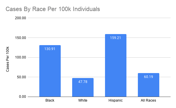 The impact of this is startling when we view the impact of the cases per 100,000 members of a certain demographic. The chart below shows that while only 47 people per 100,000 white Iowans have contracted the disease, 131 and 159 per 100,000 members of the Black and Hispanic communities respectively are affected.