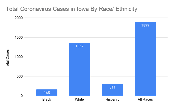 According to the Census Bureau, Iowa is 90.7% white, but coronavirus cases in the state are only 73.3% percent white. This leaves the Black and Hispanic communities more heavily hit. The population of Iowa is only 4% Black, but Black Iowans make up 8.7% of coronavirus cases. The Hispanic population is also hit disproportionately hard as the population of the state is only 6.2% Hispanic, but 16.4% of COVID-19 cases in the state come from that community.