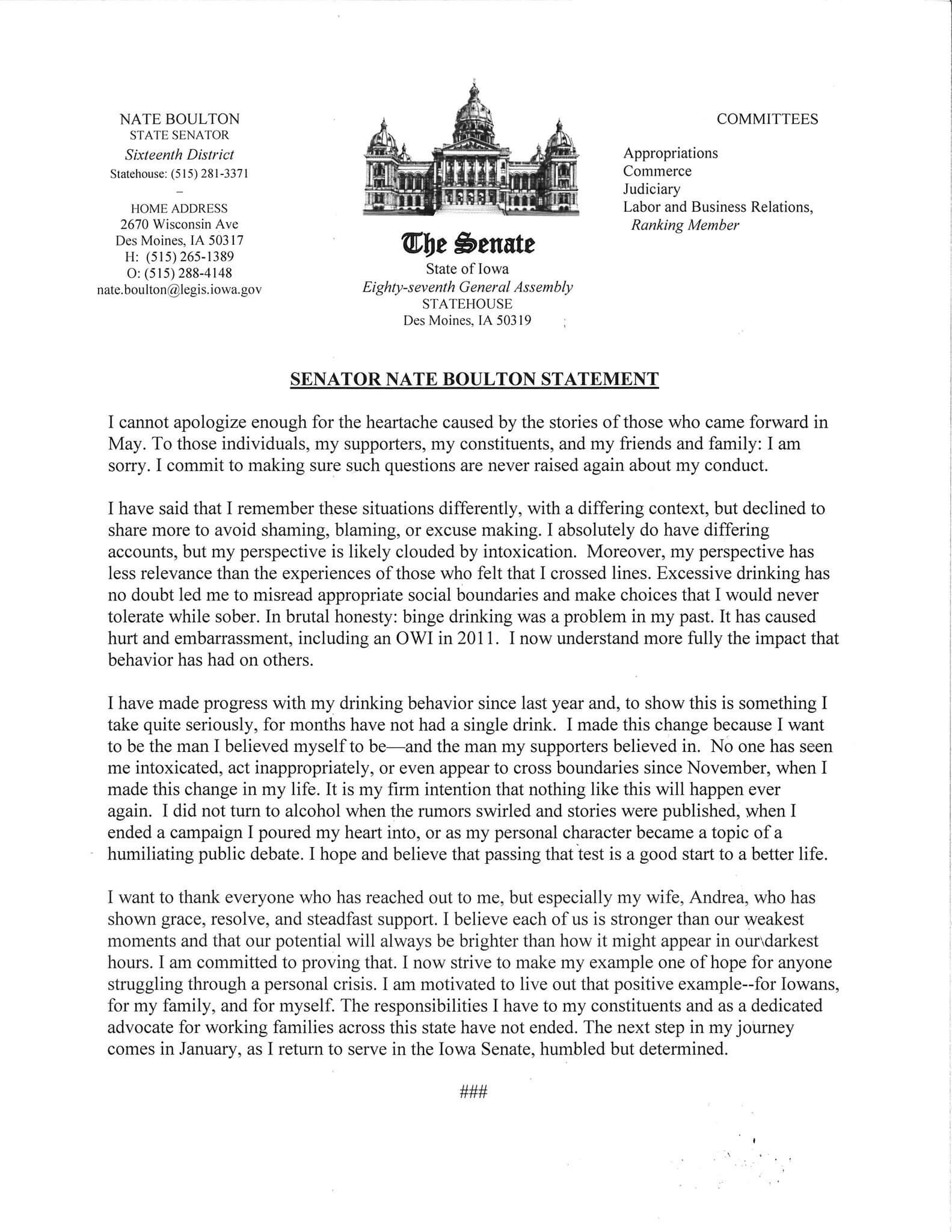 “I am disappointed by Senator Boulton’s decision,” Petersen wrote. “When I called on Senator Boulton to resign two months ago, I did it because, like many Iowans, I believe that sexual harassment and misconduct should not be tolerated by anyone, anywhere. Senator Boulton will now need to answer to voters in his district, to a potential independent investigation, and to other Iowans involved in the national conversation on this important issue.”
